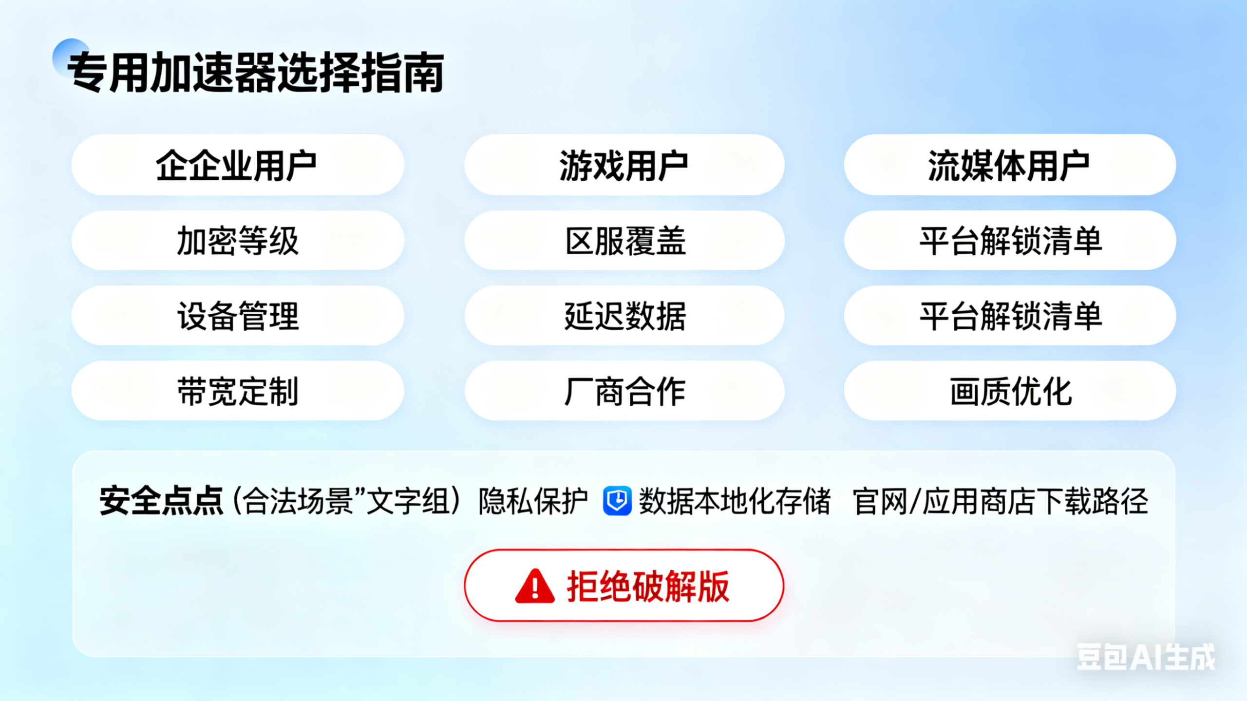 一是 “坚守合规使用”,根据《中华人民共和国网络安全法》,专用加速器仅可用于合法场景(如企业合法跨境办公、个人合规观看海外正版流媒体),禁止用于访问非法内容、传播违法信息,企业用户需确保加速网络仅用于工作相关需求,避免违规使用。
